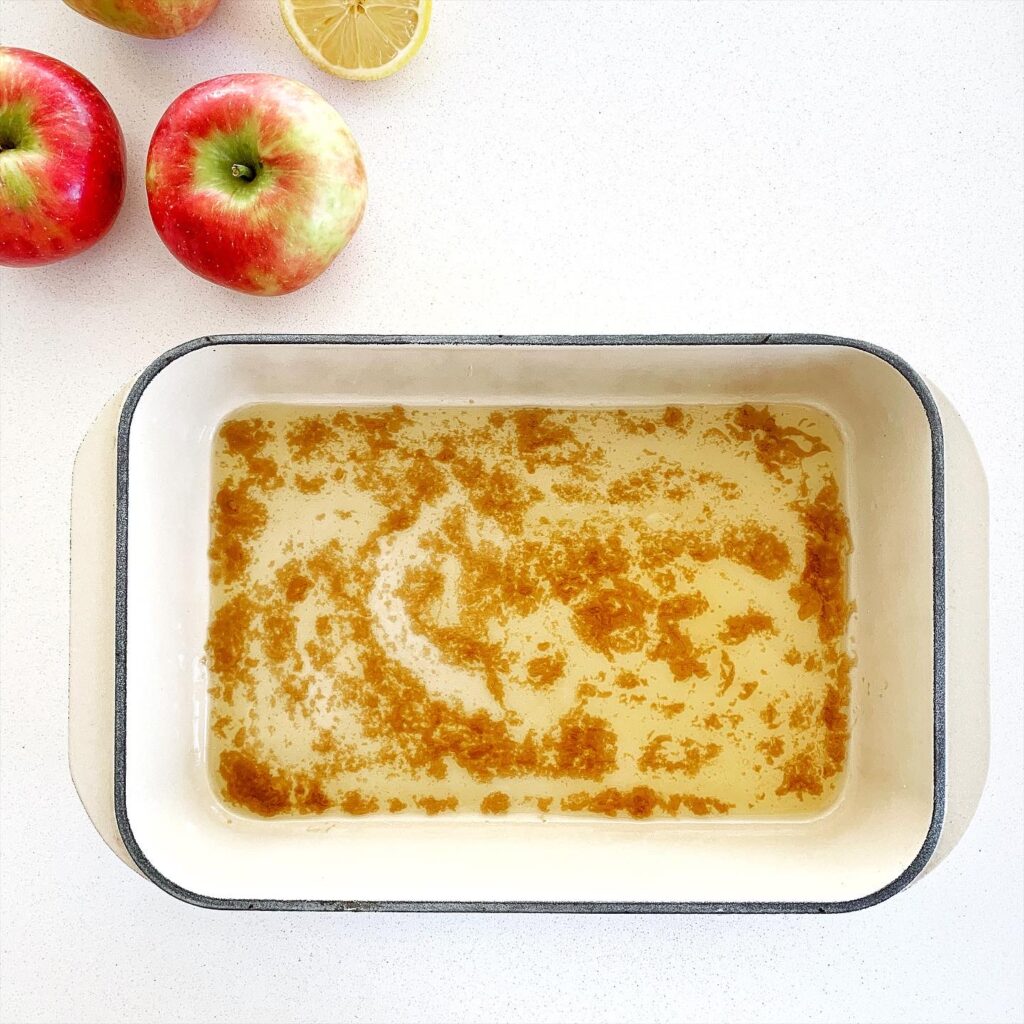 - In a small bowl, add the lemon juice. As you start cutting the apples in slices, place them directly into the lemon juice bowl so they don’t brown. Add 1 tbsp of brown sugar and toss the apples.