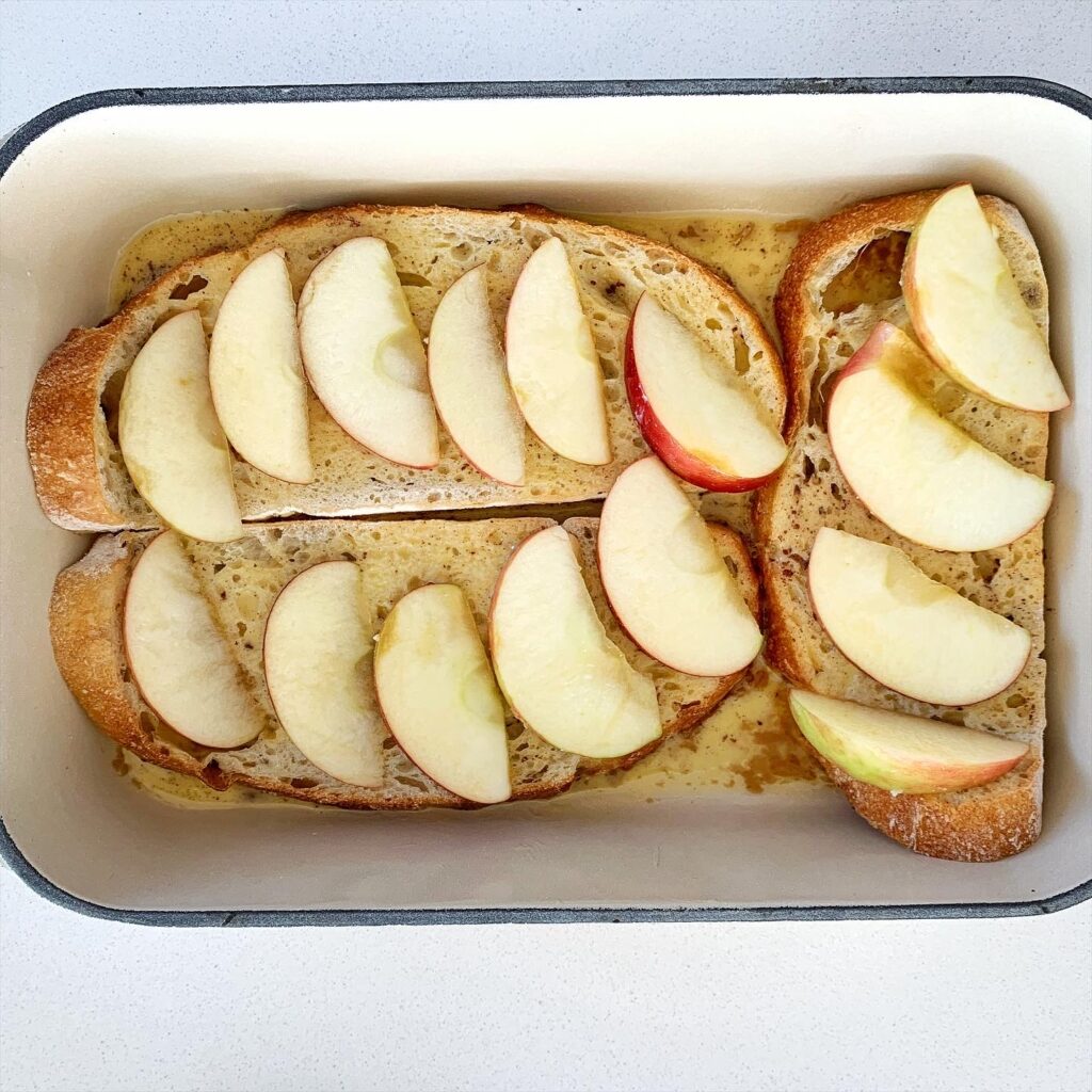 - Layer the bread in the bottom of the baking dish, pour half of the egg mixture over and add a layer of apples. Repeat with a second layer of bread, egg mixture and apples.