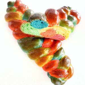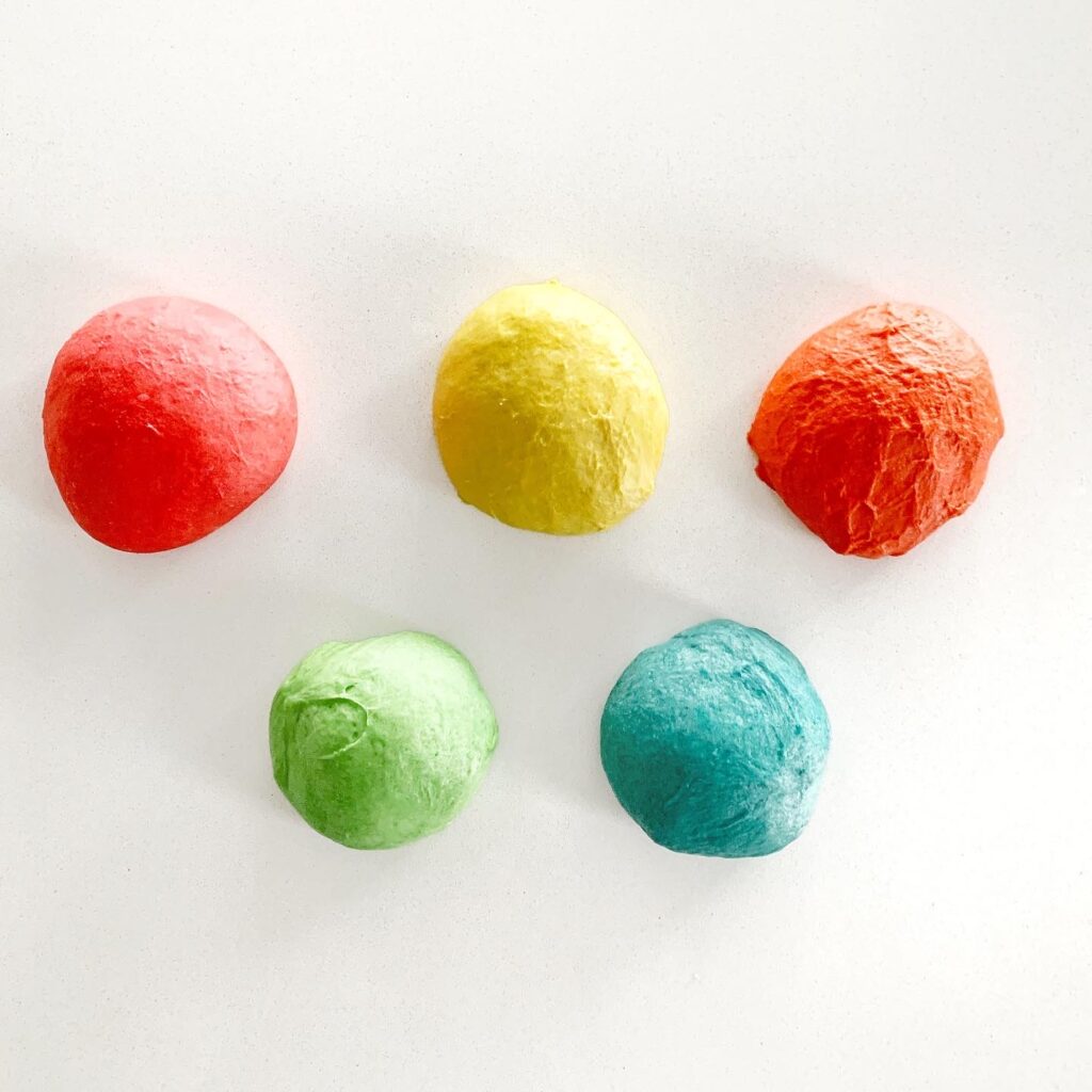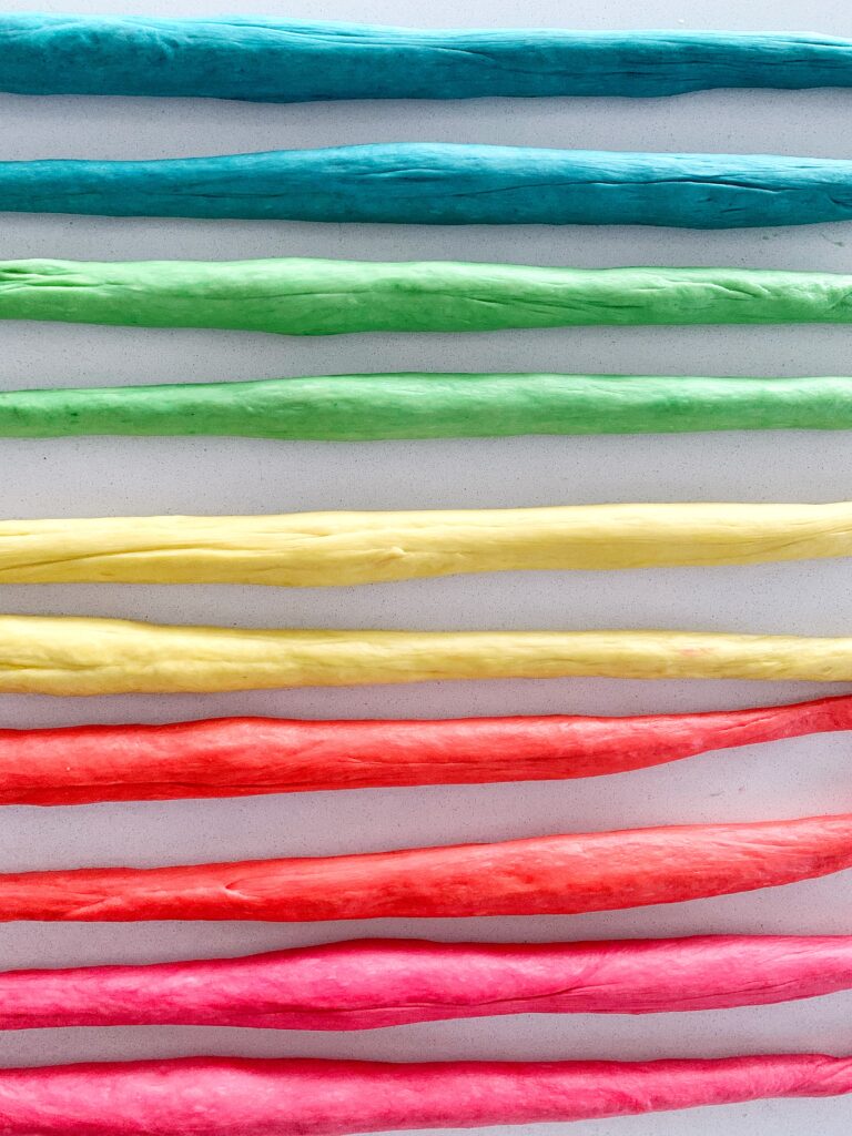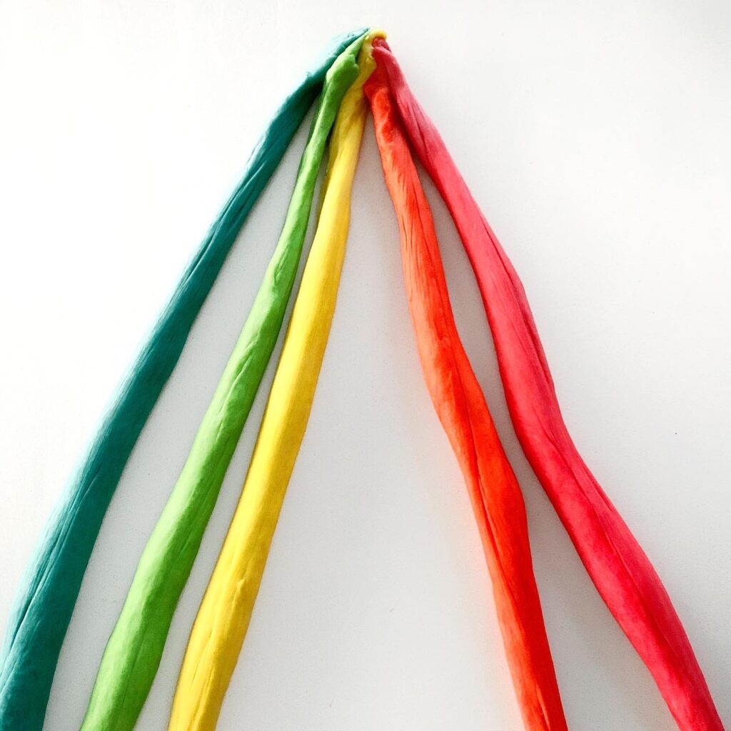- If making rainbow Challah, cut all balls in half and roll out to 18” strands. You’ll have 10 strands (2 strands per colour). Separate strands into two sections of 5 strands.