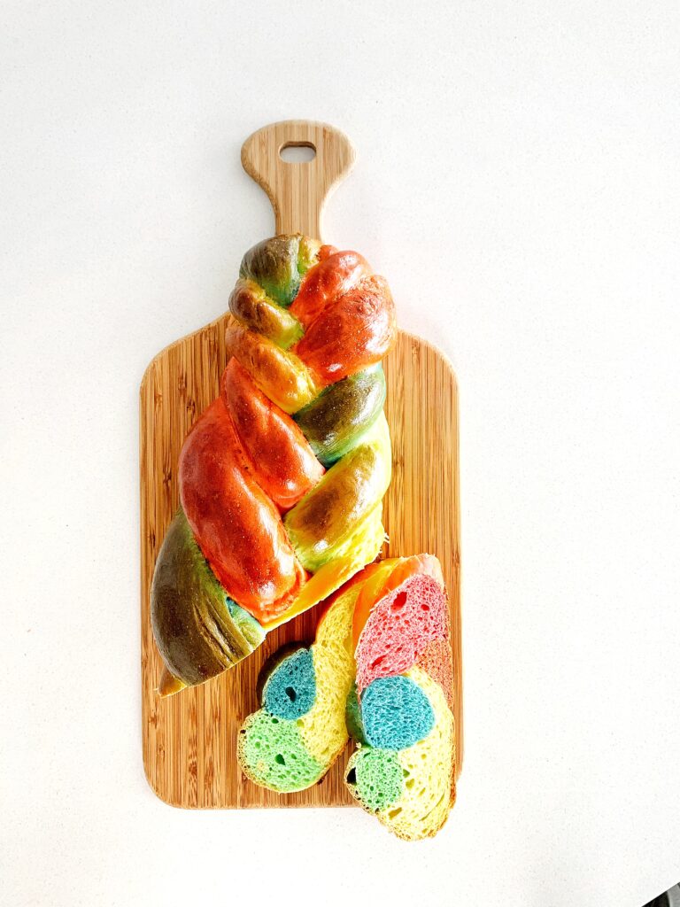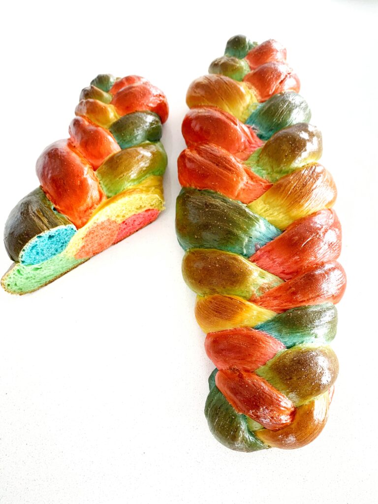 - If making rainbow Challah, divide dough in 5 balls, add colouring and knead until well blended. When done, let rise in 5 greased bowls covered in plastic wrap for 1-1.5 hours.