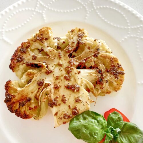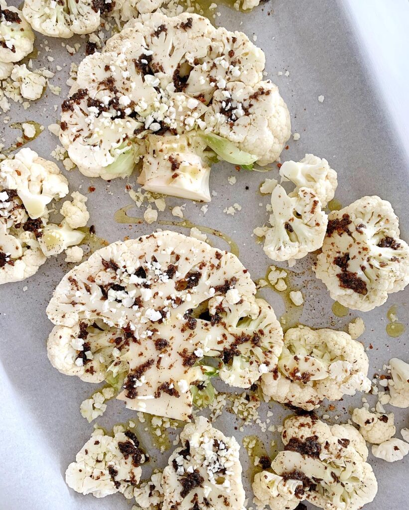 • Cut cauliflower into 1 inch thick slices and place on baking sheet.