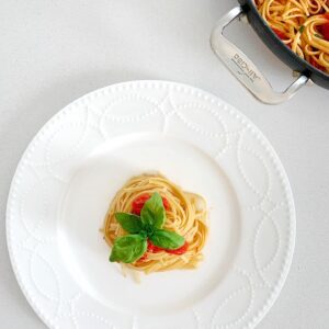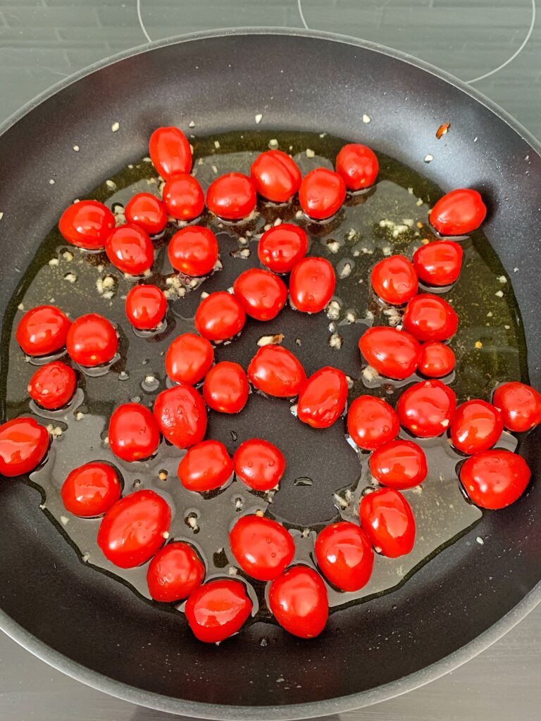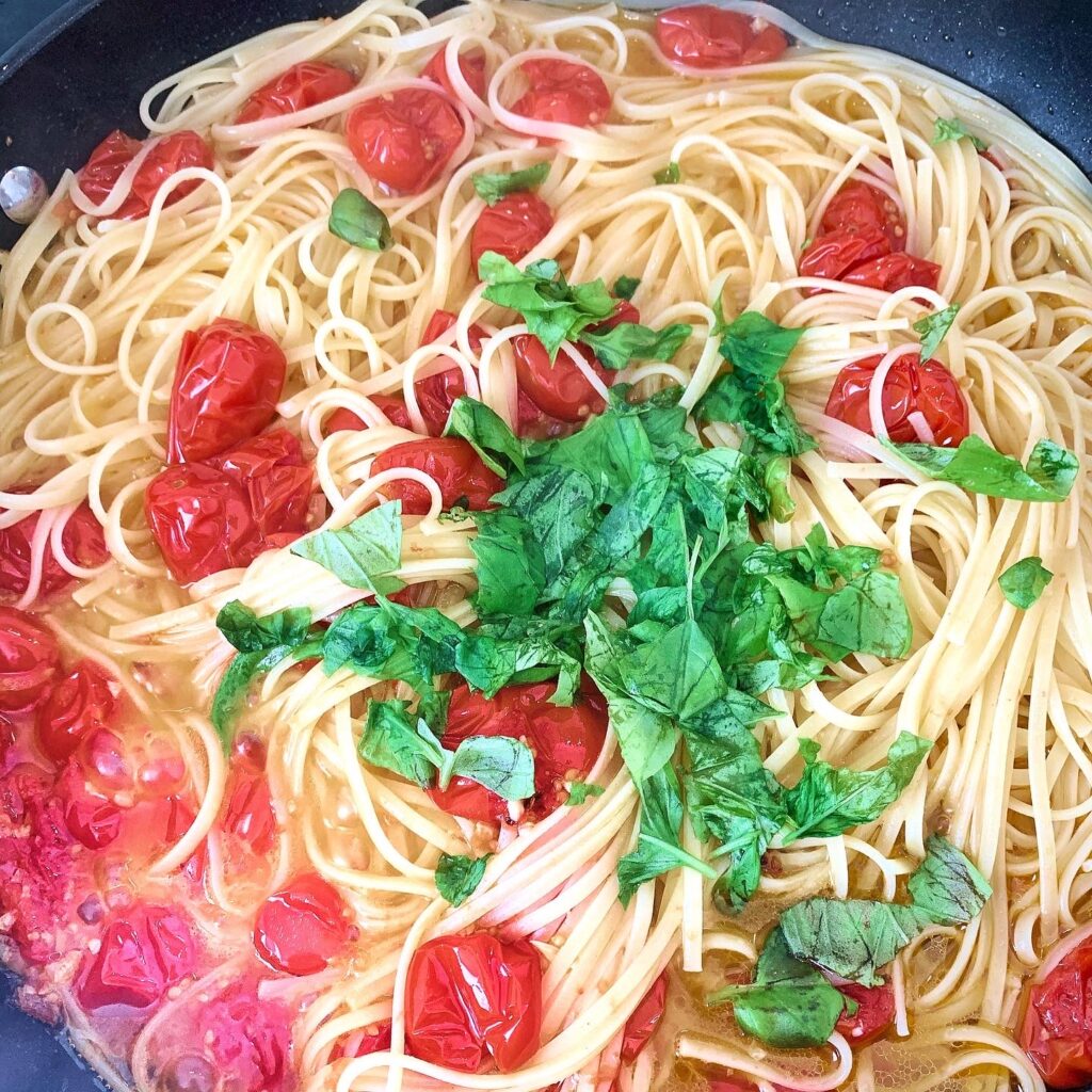 - When tomatoes are all blistered, the sauce is ready! (If impatient, you can help the tomatoes pop by squishing them with a wooden spoon) Drain the pasta and ALWAYS keep 1 cup of the pasta water. Add the pasta and basil to the sauce pan and add about 1/2 cup of the reserved boiling water. Cook for about 1-2 min until the sauce thickens nicely. Enjoy! 😋 🍝