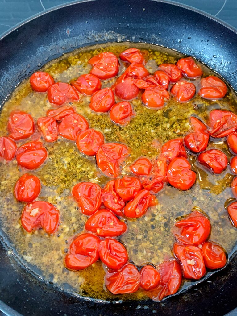 - Add the garlic, spicy pepper, salt and whole tomatoes. Cover pan with a lid as they will pop! Cook the tomatoes for about 20-25 min on medium-low heat, stirring occasionally until they blister.
