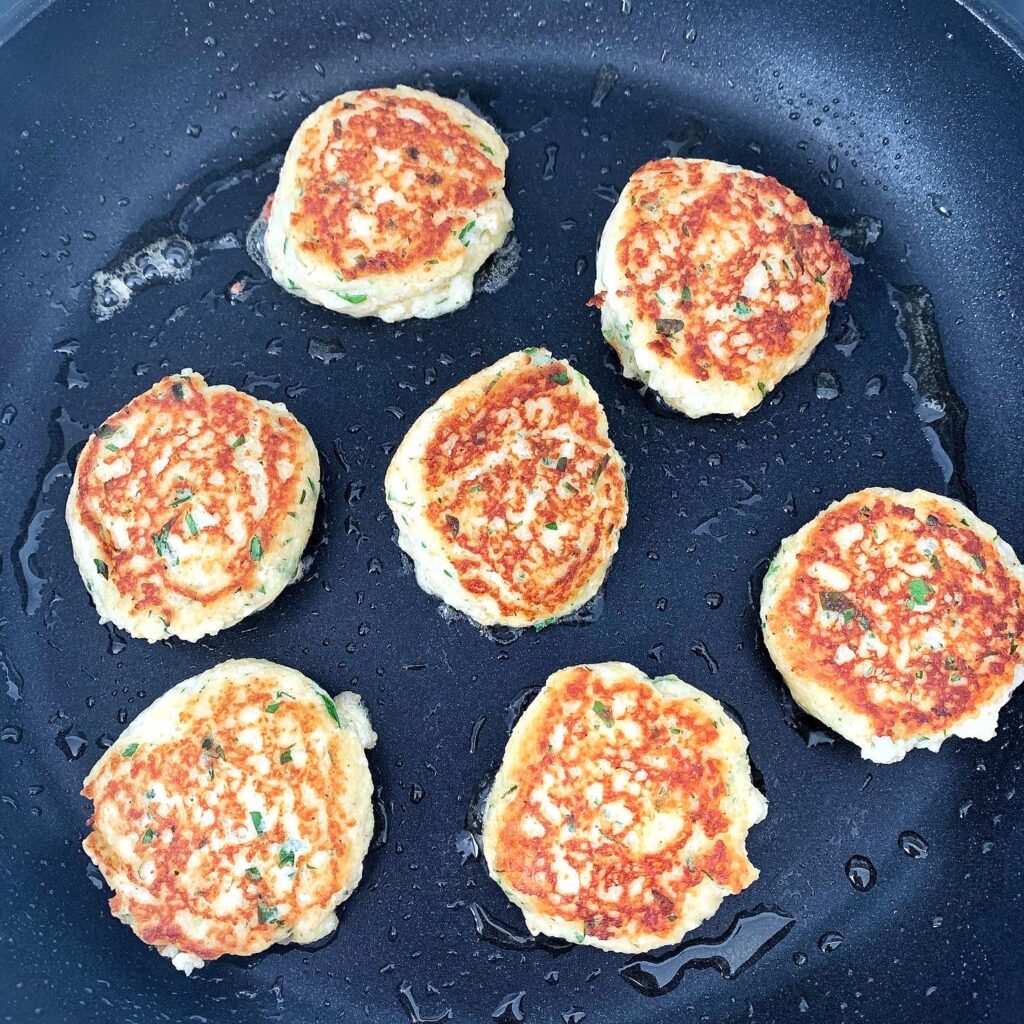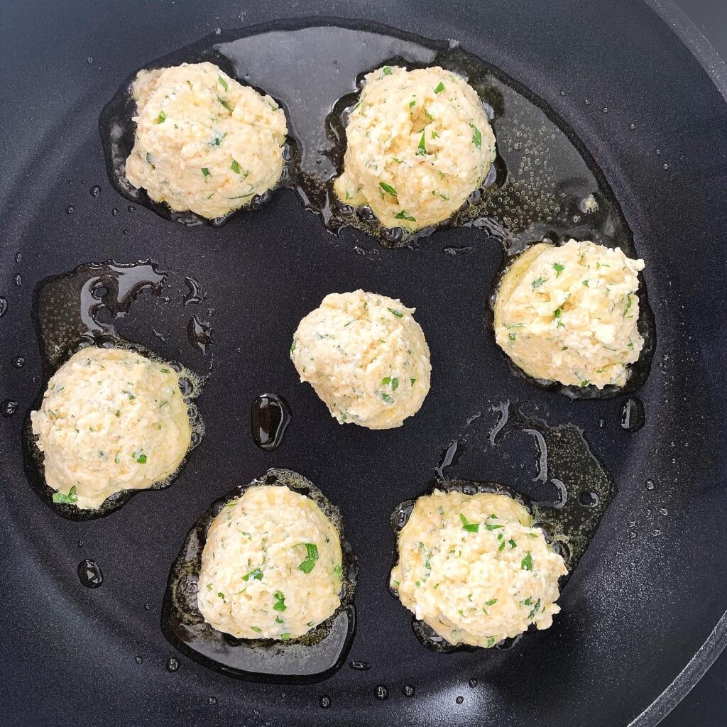 - With 2 spoons, scoop out little balls and drop them into the frying pan.