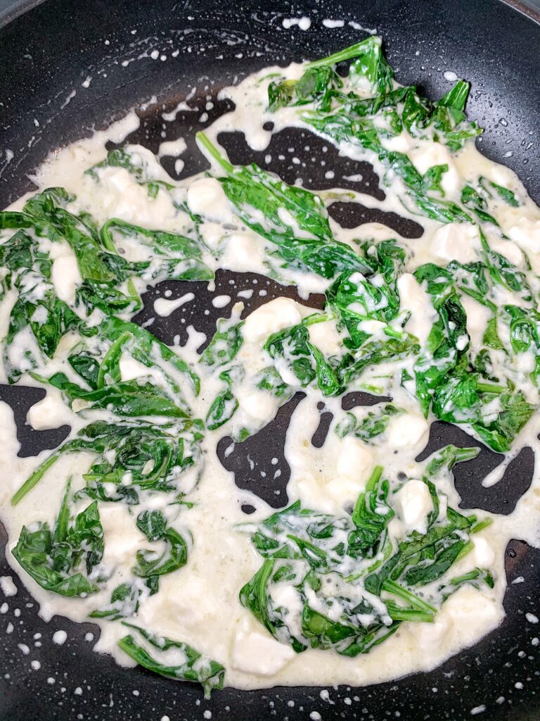 - Add the spinach, feta and lemon juice and stir until the spinach has reduced. Set aside.