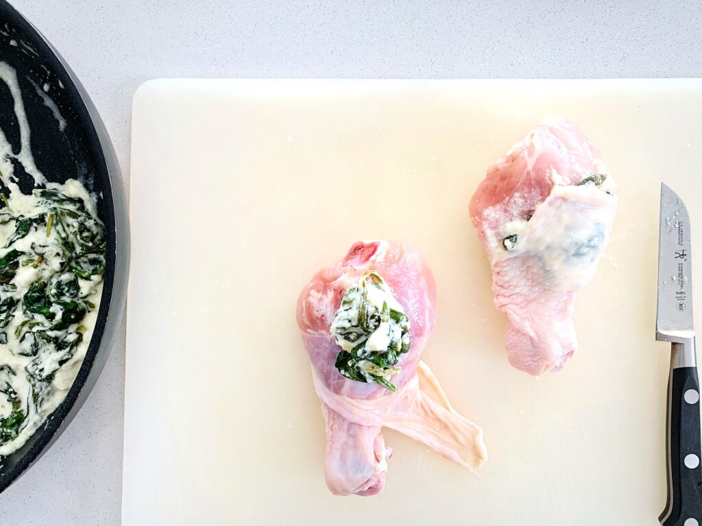 - With a spoon, scoop the feta spinach mixture and stuff it between the drumstick and skin. Pull the skin back up and place on a lined baking sheet.