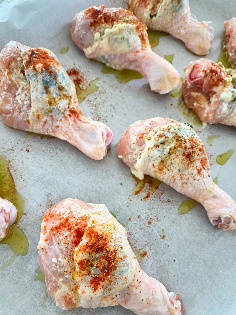 - Drizzle drumsticks with olive oil, salt and pepper them to taste, and finish with a sprinkle of paprika.