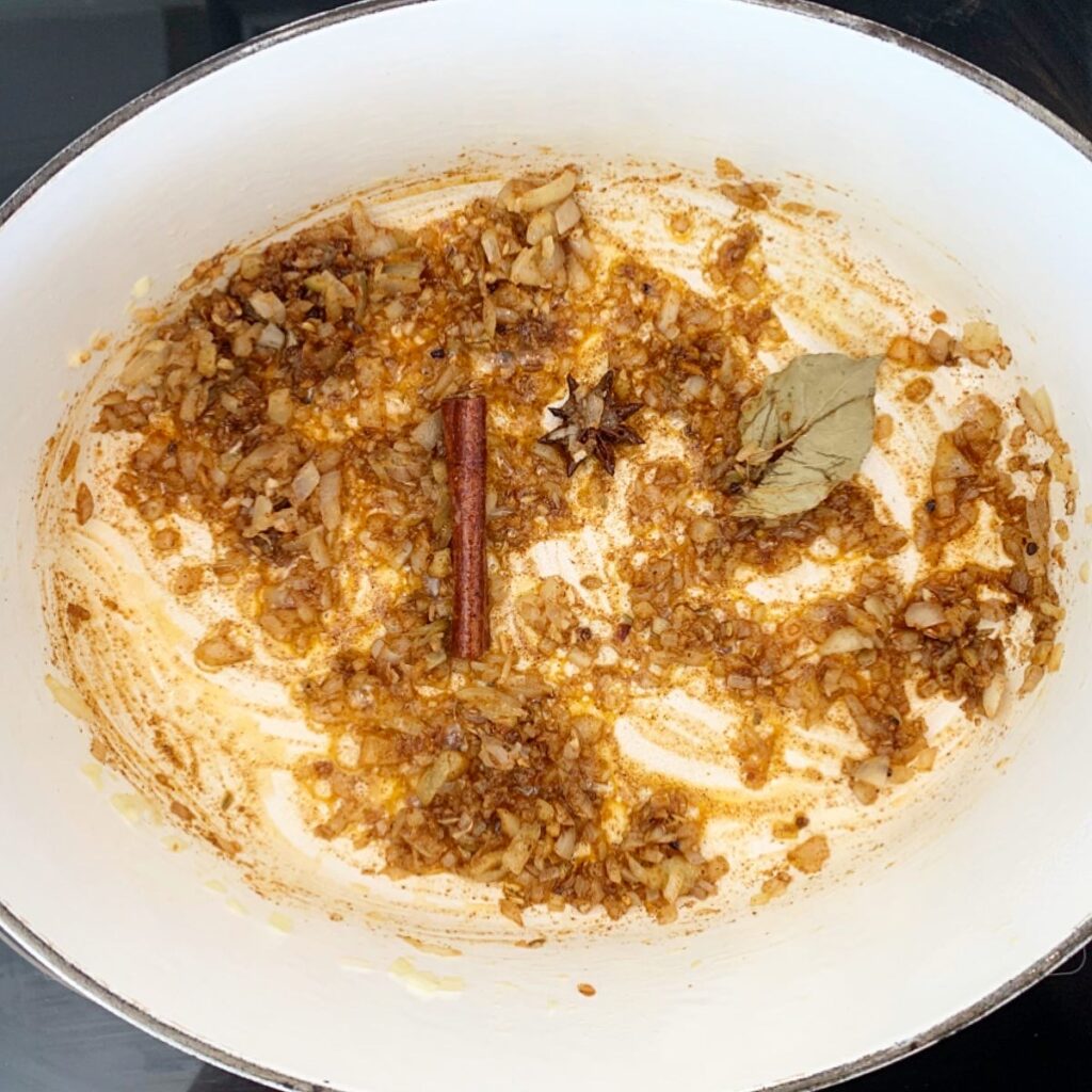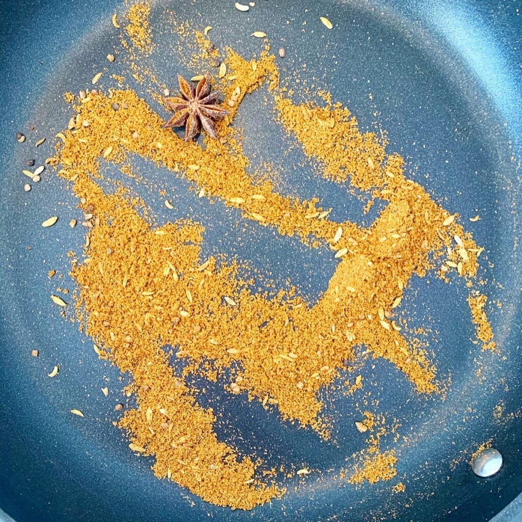- In a frying pan, toast the cloves, star anise, coriander, cumin, cayenne, fennel, garam masala, and cardamom, stirring for 30 seconds until dark and fragrant. Remove from heat and set aside. ⠀